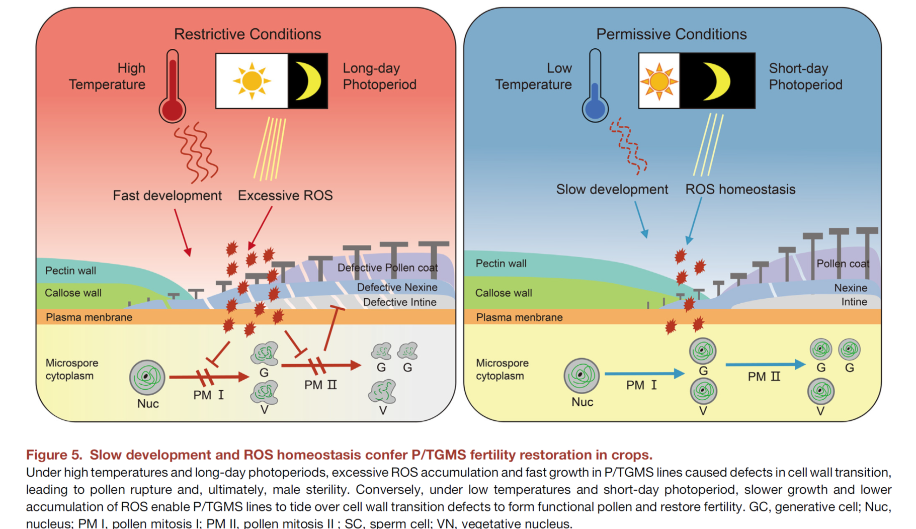 - Mechanisms of Photo-Thermo Sensitive Male Sterility (P/TGMS) and Two-Line Hybrid Seed Production in Crops: Two-line hybrid rice relies on P/TGMS lines. The shortage of reliable rice P/TGMS lines is currently a bottleneck in hybrid rice breeding. Our research group has elucidated the P/TGMS mechanisms that slow development under low temperature or short light conditions, and the effective scavenging of reactive oxygen species (ROS) are two general factors for P/TGMS fertility restoration. For details, please refer to the review (Wang et al., Molecular Plant 18:26-41, 2025). On this basis, novel P/TGMS lines of rice and maize have been created, among which ostms15, ostms16, ostms18, and ostms19 have been published. ostms15 has been applied in approximately thirty breeding units in China.