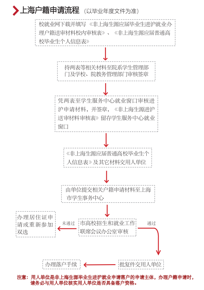 3、用人单位是毕业生落户的申请主体,请务必和用人单位做好沟通,确认用人单位的落户资格。非上海生源毕业生进沪就业申请落户,须由用人单位一次性提交申请材料。如未通过落户申请,不再受理由其他用人单位提交的申请材料。