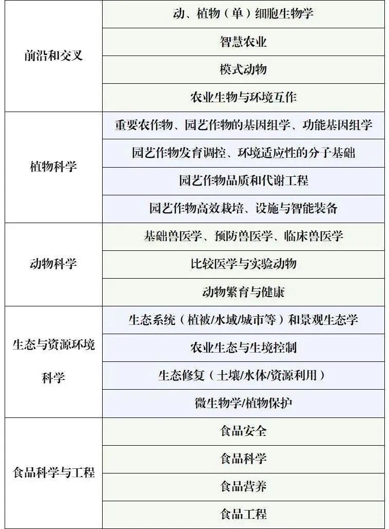围绕国家新农科建设,聚焦植物科学动物科学生态与资源环境科学食品科学与工程四个领域,重点打造以下方向: