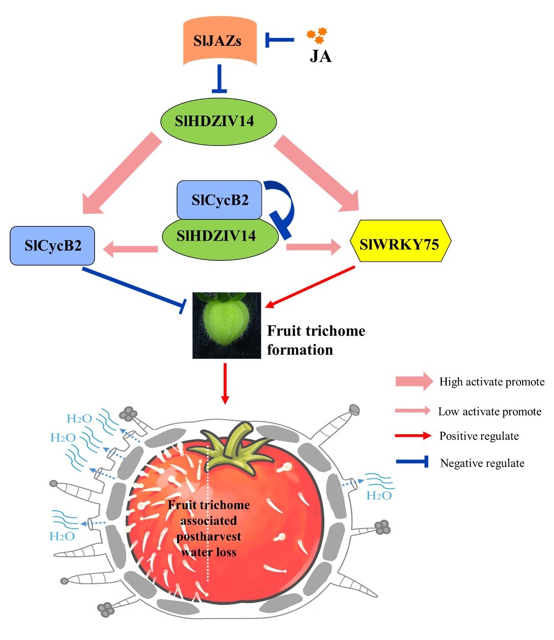 图2. SlHDZIV14通过调控番茄果实表皮毛形成影响采后水分损失的机制模型