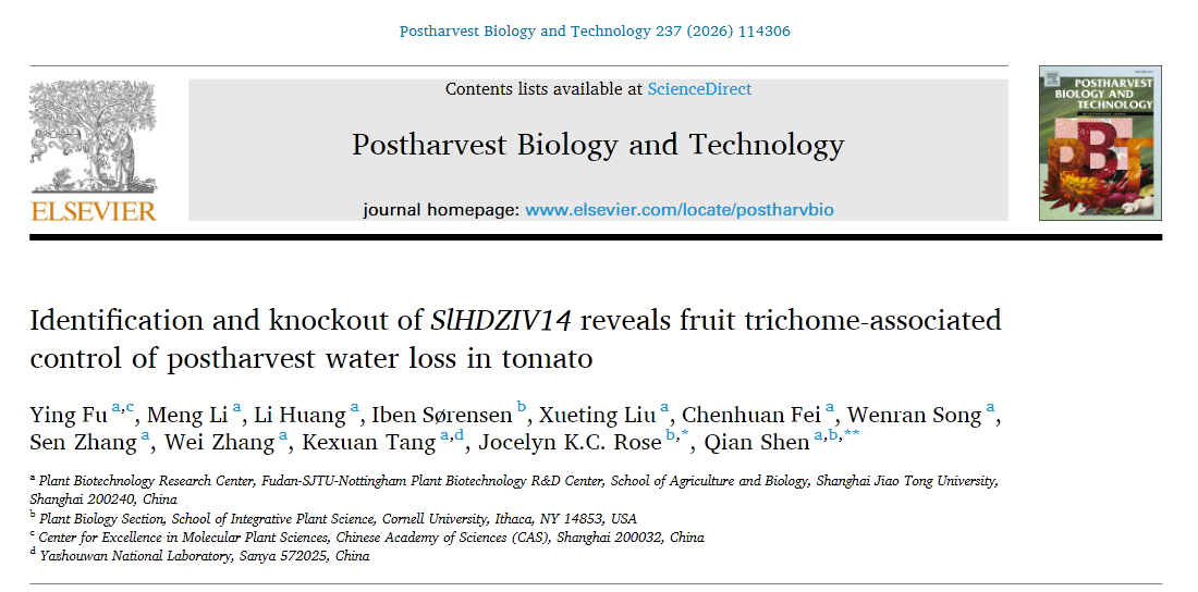 近日,这一领域取得突破性进展。Av解说 沈乾/唐克轩教授团队与美国康奈尔大学Jocelyn K. C. Rose教授团队在采后生物学顶级期刊 Postharvest Biology and Technology 发表题为“Identification and knockout of SlHDZIV14 reveals fruit trichome-associated control of postharvest water loss in tomato”的研究论文。该研究阐明了HD-ZIP IV家族转录因子SlHDZIV14通过调控果实毛密度影响采后失水率的分子机制,为番茄采后保鲜技术开发提供了全新靶点和新思路。
