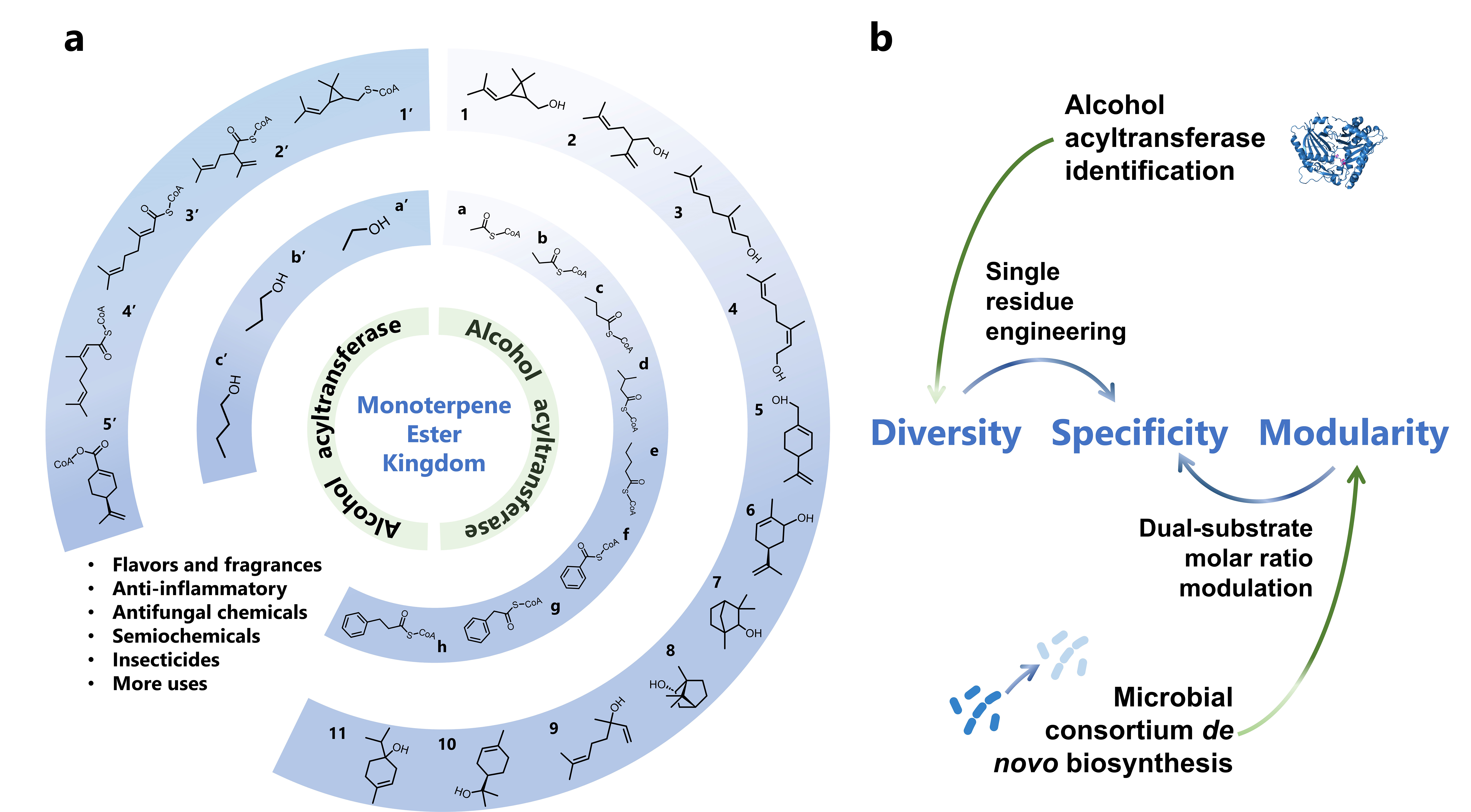 天然酯类广泛存在于花卉、果实、传统发酵食品及药用植物中,是构成果香、花香等特征风味重要物质基础,也在香精香料、食品添加剂、化妆品等领域具有重要应用价值。单萜是风味酯类分子的重要来源之一;其中,单萜酯则广泛分布于玫瑰等芳香植物、酿造食品以及各类酰基化天然产物中。通过代谢工程重构微生物合成途径,实现单萜酯精准合成,不仅契合绿色生物制造发展方向,也有望满足对手性/异构成分定制需求。但如何在微生物体内高效、精准地合成结构复杂单萜酯,始终是该领域面临的重要挑战,其核心瓶颈在 AAT 底物选择性不足、催化产物易混杂,以及单萜醇与酰基辅酶 A 前体供给难以协同匹配。